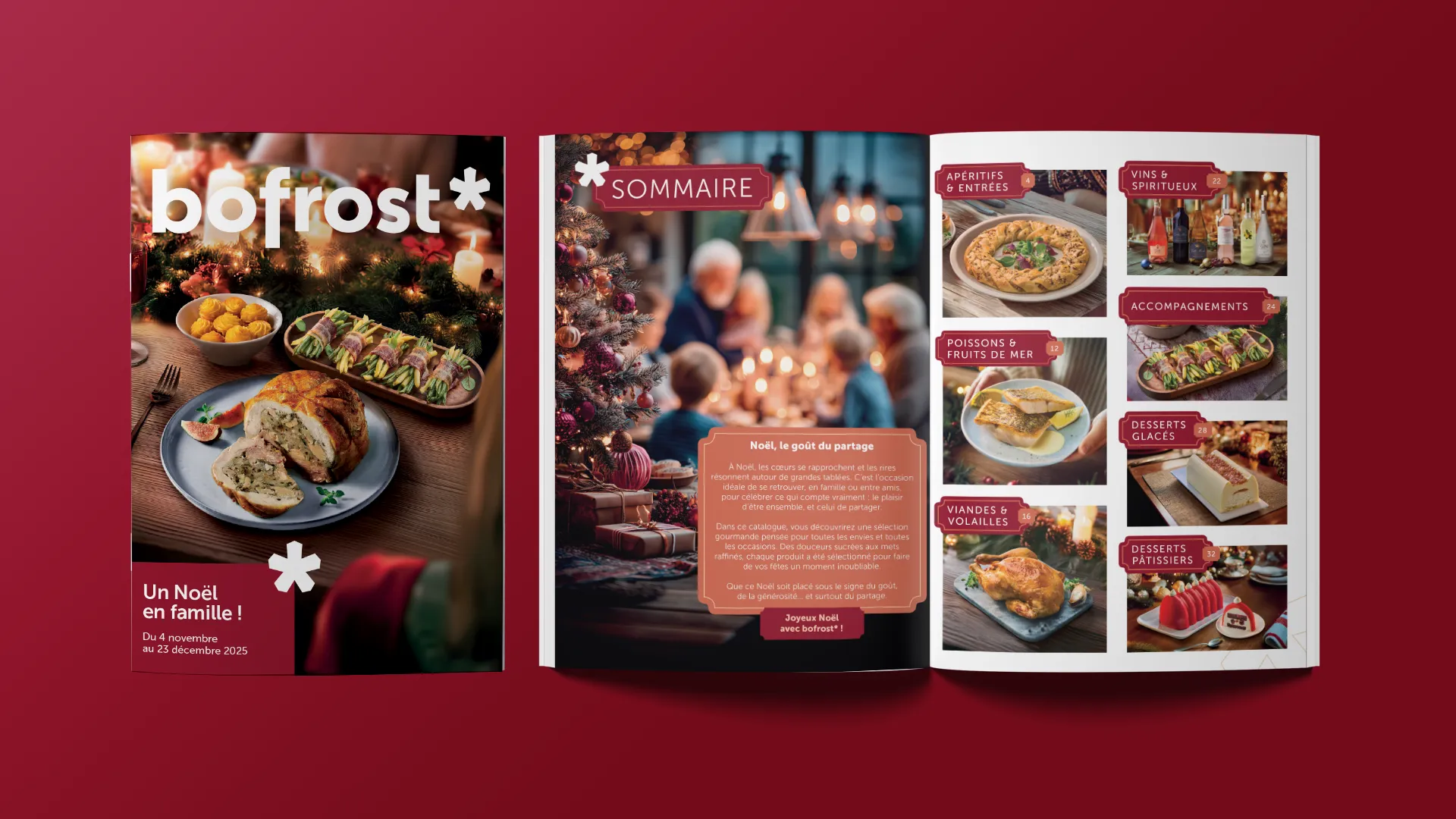 Mizu a orchestré, pour la deuxième année consécutive, la création du catalogue de Noël pour Bofrost France en adoptant de nouveau une approche visuelle audacieuse. Pour sublimer la gamme festive, notre agence a fusionné de véritables pack shots culinaires avec des fonds générés par intelligence artificielle. Cette technique hybride associe la gourmandise des photographies à la magie de décors virtuels créés sur mesure. Le résultat offre une immersion haut de gamme qui valorise chaque spécialité. Ce travail illustre l’expertise de Mizu mêlant savoir-faire artistiques et innovations technologiques.