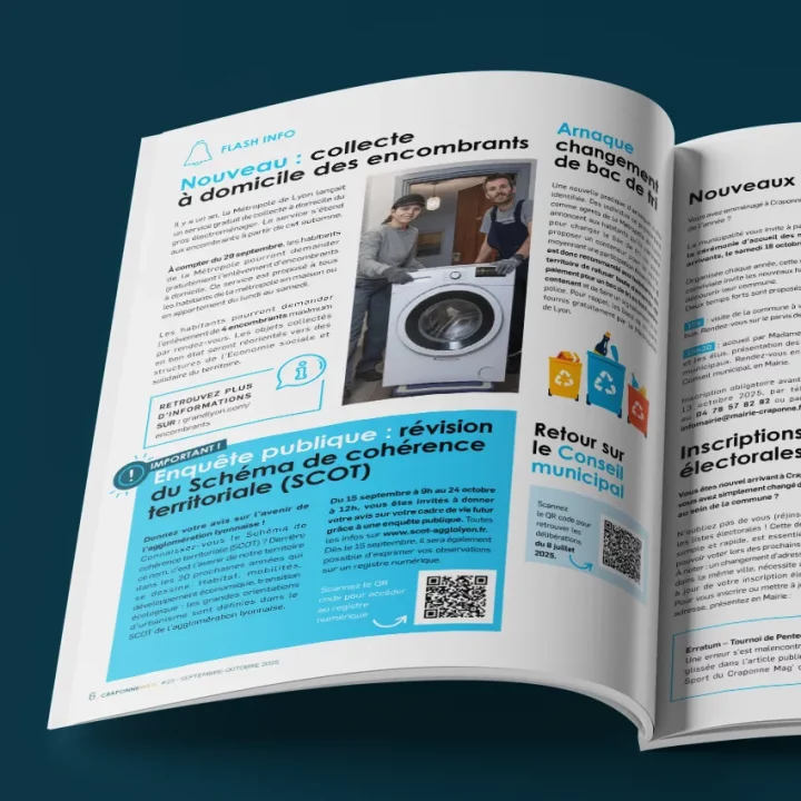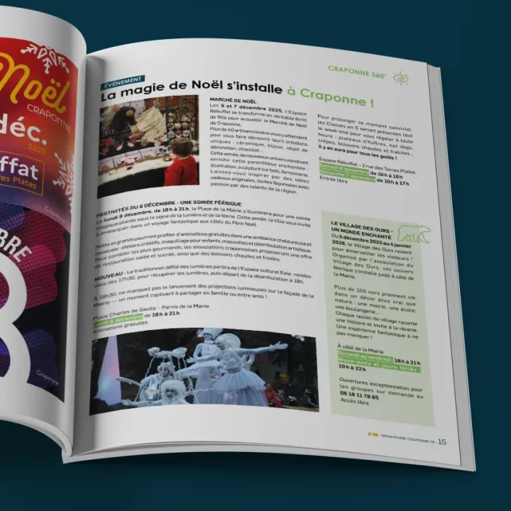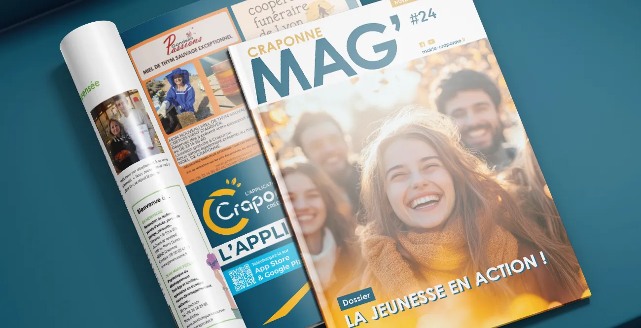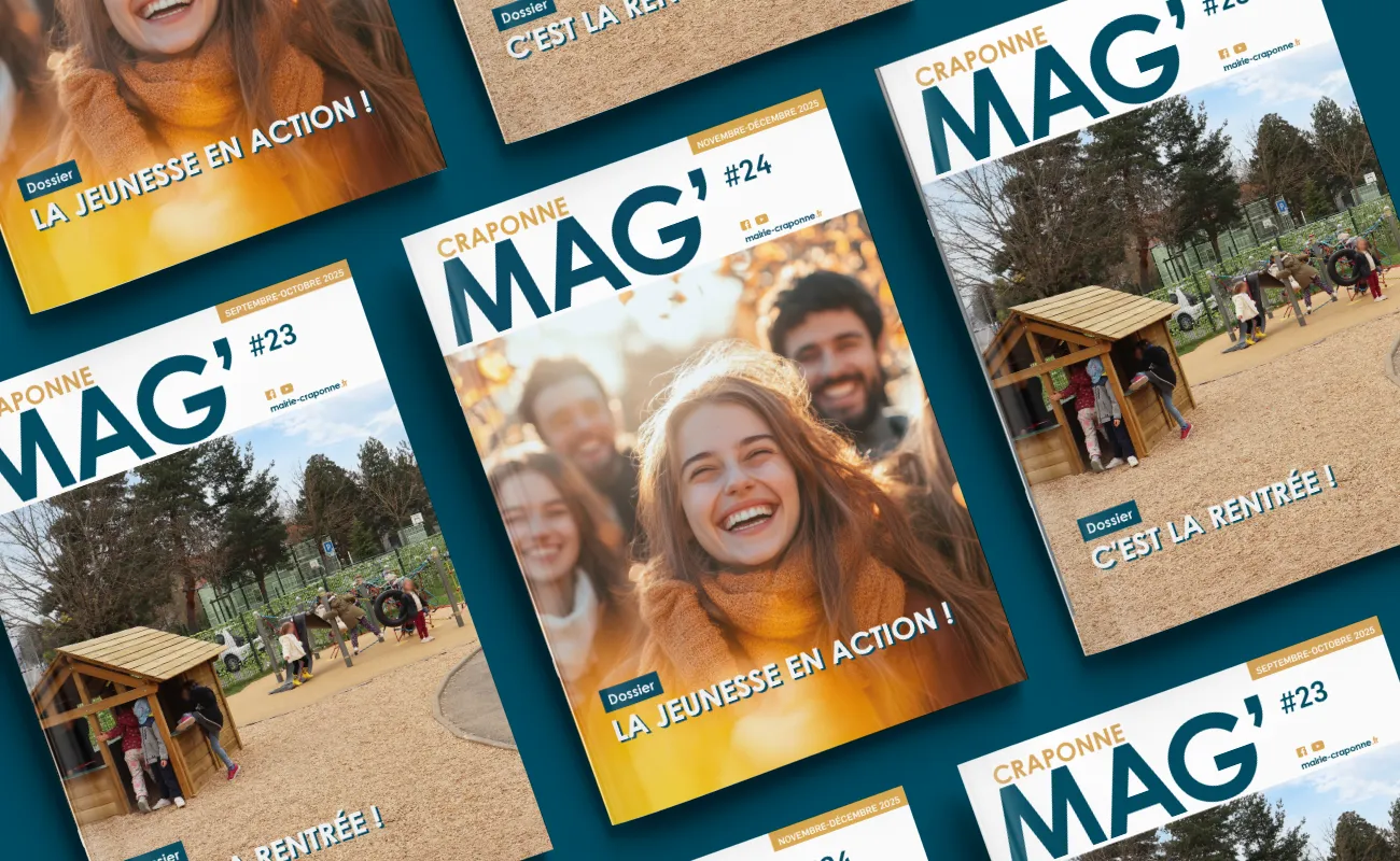 Mizu travaille main dans la main avec la ville de Craponne pour dynamiser sa communication globale. Nous accompagnons la municipalité dans la création de ses supports institutionnels, culturels et multimédias. Notre équipe assure notamment la conception graphique et la mise en page de Craponne Mag’, le magazine phare qui rythme la vie des habitants au fil des saisons. À travers un design moderne et une approche sur mesure, Mizu valorise l’image de cette commune active de l’Ouest lyonnais. Ce partenariat permet de mettre en lumière les projets locaux et de renforcer le lien avec les citoyens.